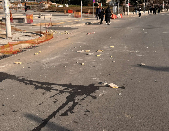 Η Εγνατία θυμίζει βομβαρδισμένο τοπίο με τους κουκουλοφόρους να έχουν ξεκολλήσει ακόμα και πλάκες από τα πεζοδρόμια μπροστά από το ΑΠΘ.